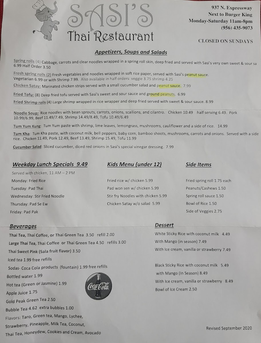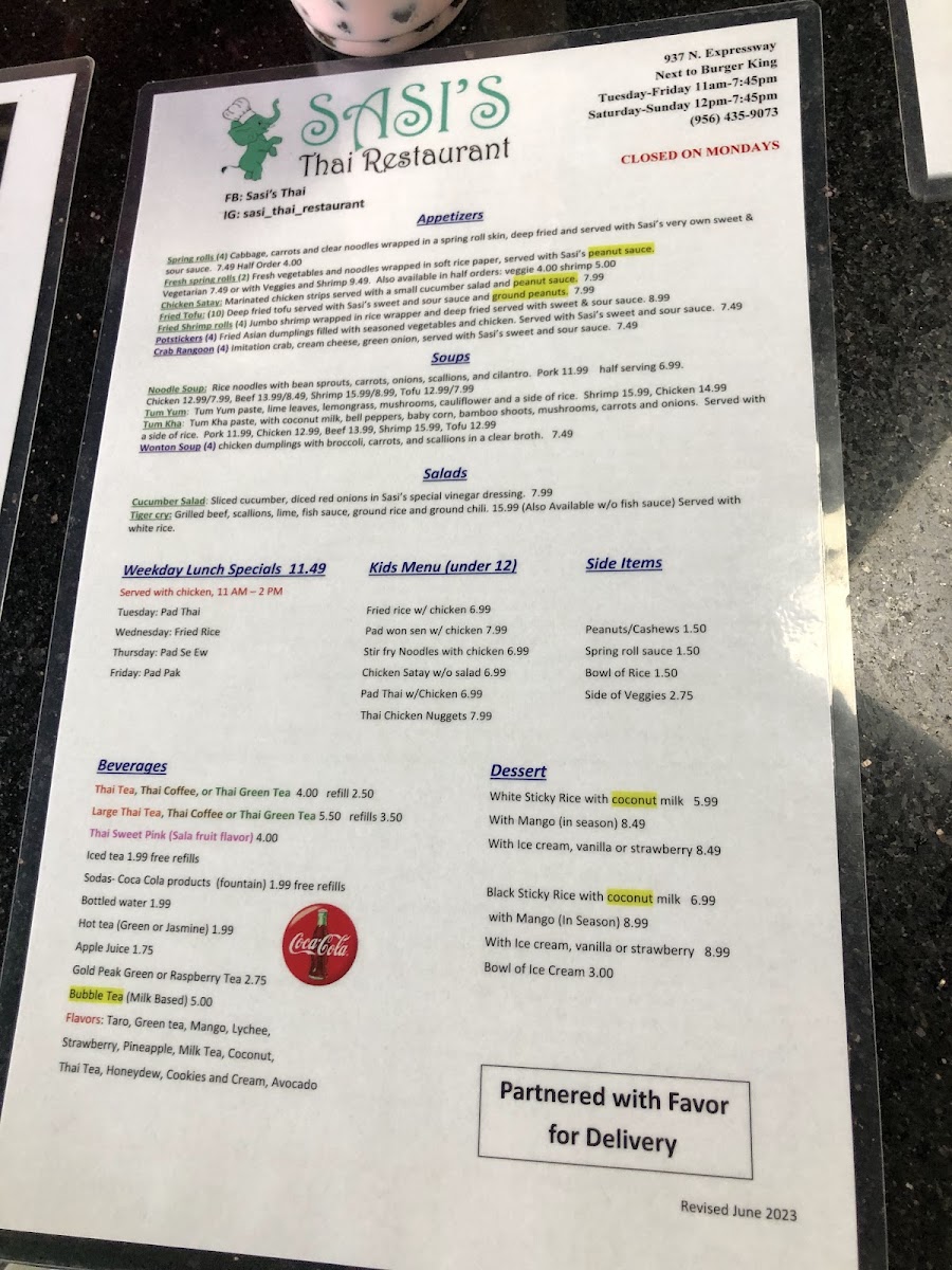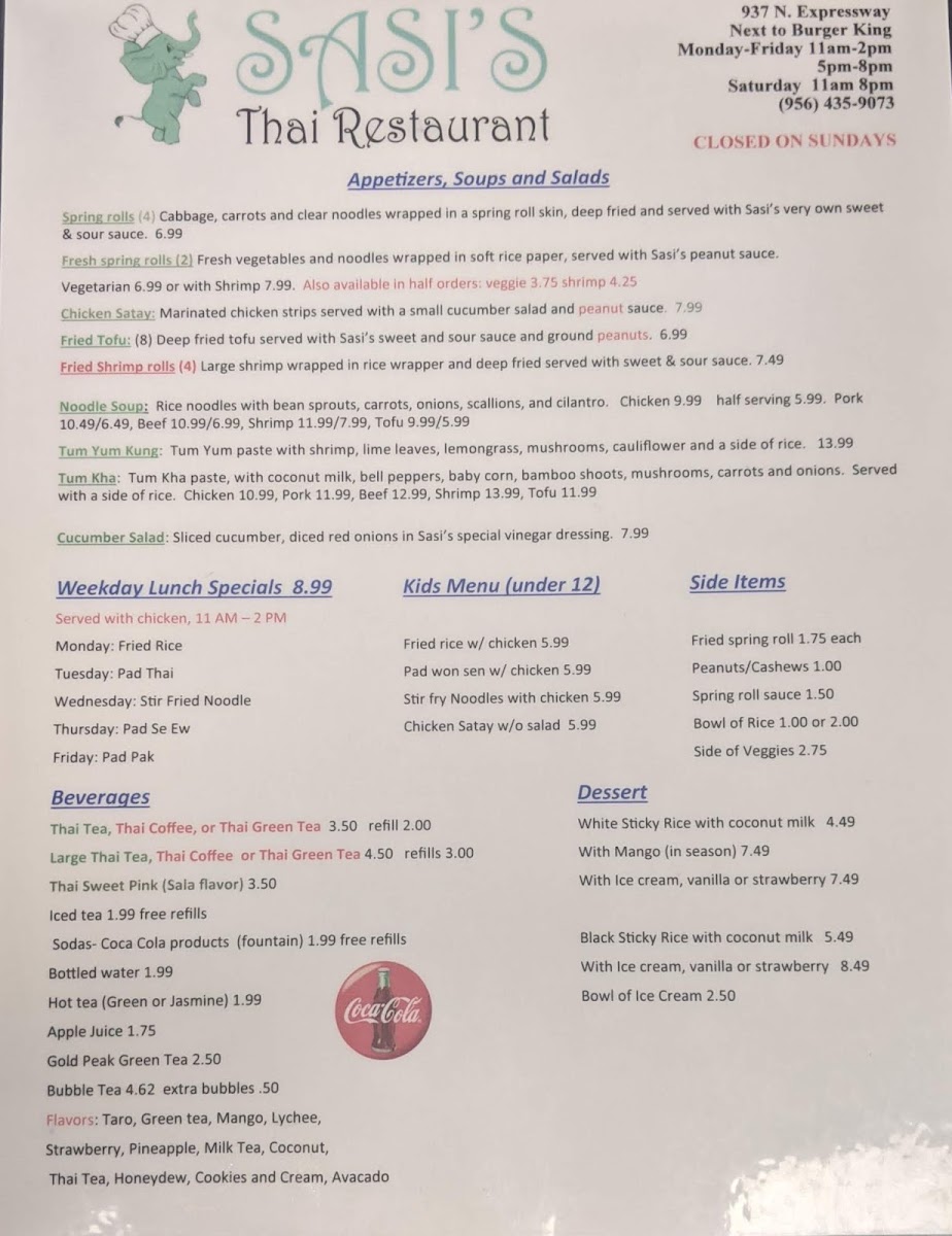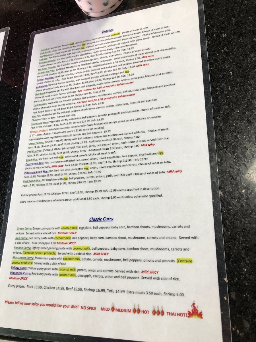 Sasi's Thai Menu